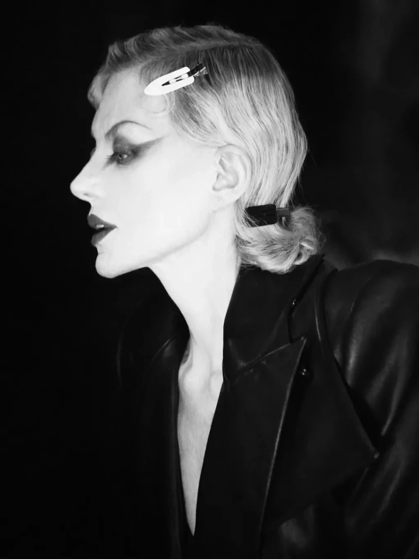 Рената дефилировала в чёрном кожаном жакете с объёмными плечами и плиссированной длинной юбке. Образ дополняли сапоги и перчатки, а финальным штрихом стал макияж в готическом стиле с длинными стрелками и алыми губами.