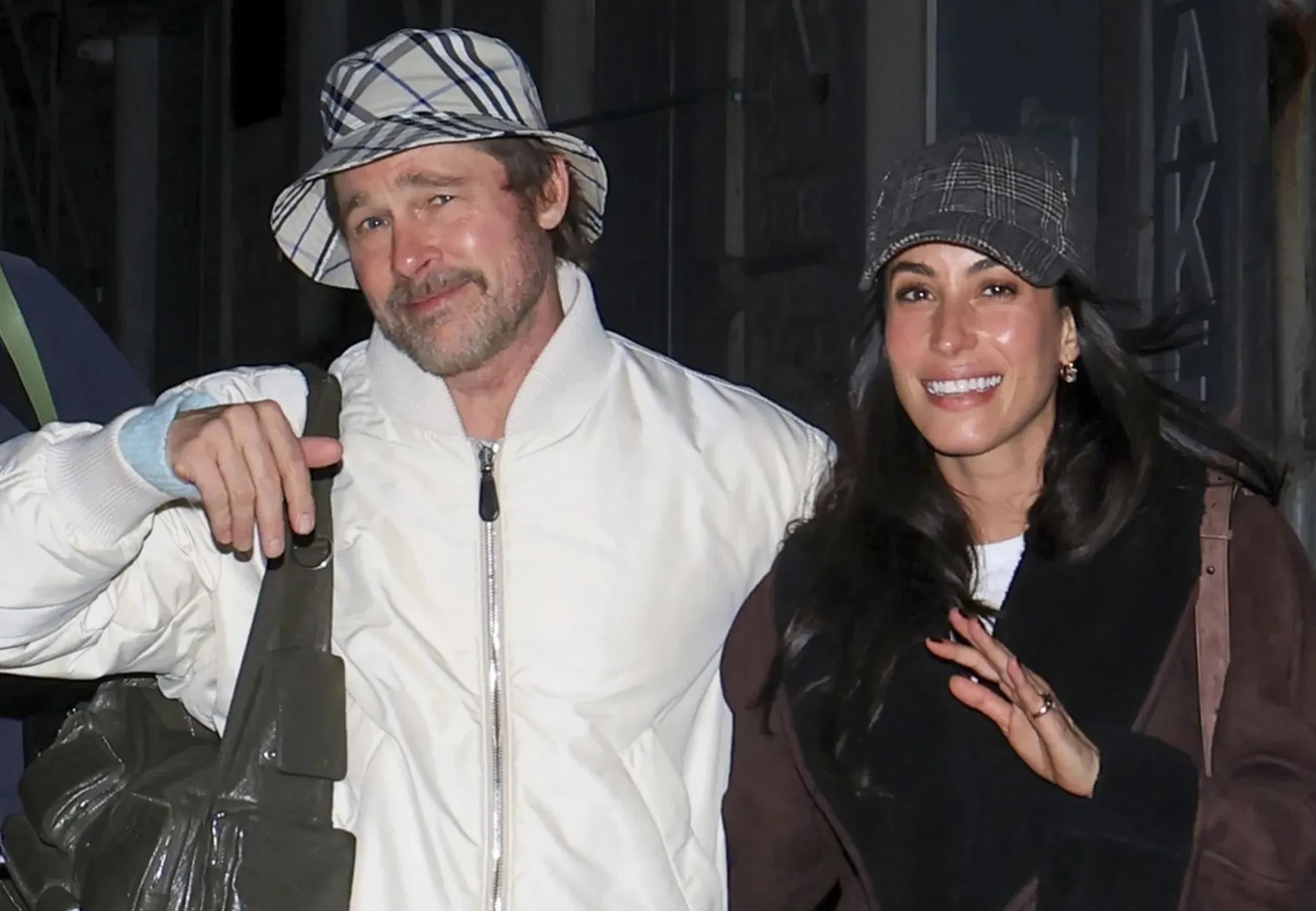 Для вечернего променада Питт выбрал белый бомбер, бирюзовый джемпер и свободные серые брюки, дополнив образ панамой Burberry и объёмной сумкой цвета хаки со множеством карманов. Его 33-летняя возлюбленная надела коричневый полушубок и расклешённые легинсы. Наряд завершала клетчатая бейсболка и замшевая сумка.