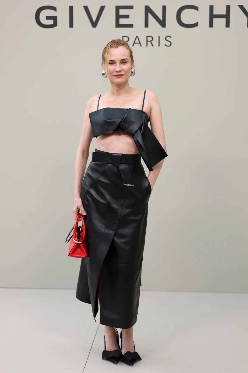 Кьяра ФерраньиУже ближе к вечеру свою коллекцию представил Givenchy. 37-летняя Элизабет Олсен пришла на шоу в сером жакете и чёрных кожаных джоггерах, дополнив образ сумкой, браслетом и босоножками с бантами. 49-летняя Диана Крюгер, блиставшая до этого на показе Isabel Marant, выбрала чёрный комплект из топа и юбки-миди, а нечастая гостья подобных мероприятий 40-летняя Руни Мара надела "на голое тело" синий брючный костюм в полоску.