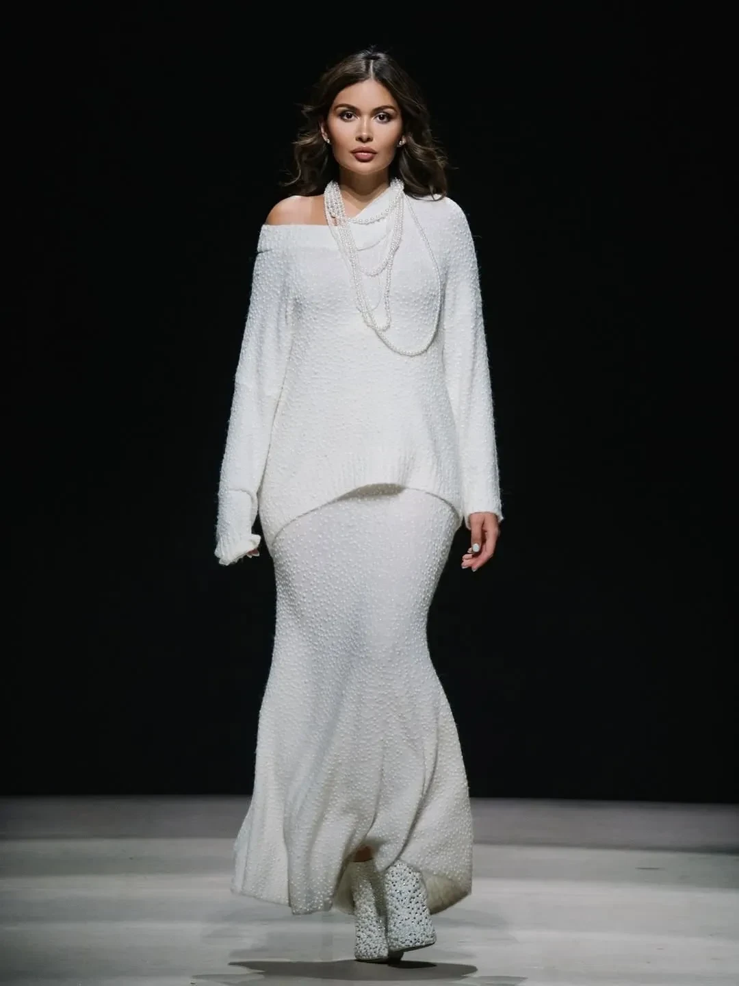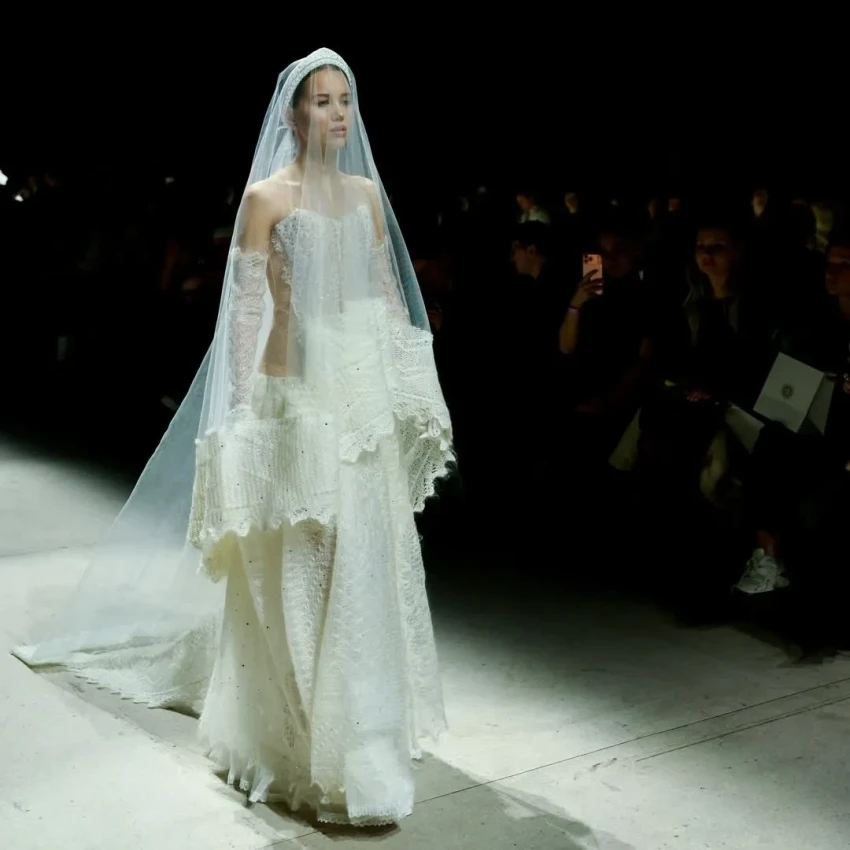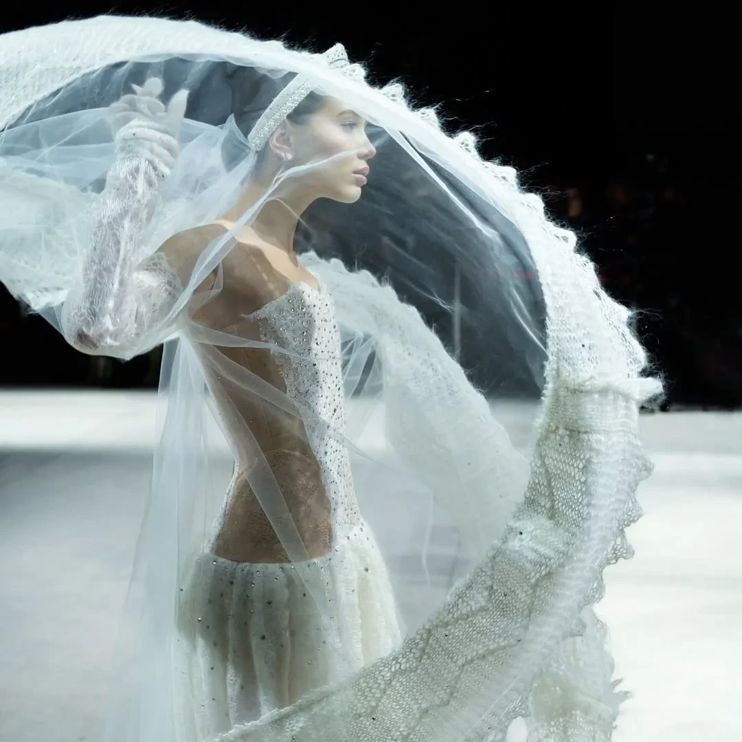 20-летняя Аврора Киба вышла на подиум в свадебном образе с фатой в финале шоу, а 27-летняя Марьям Тилляева открыла показ в белом свитере и юбке в тон.