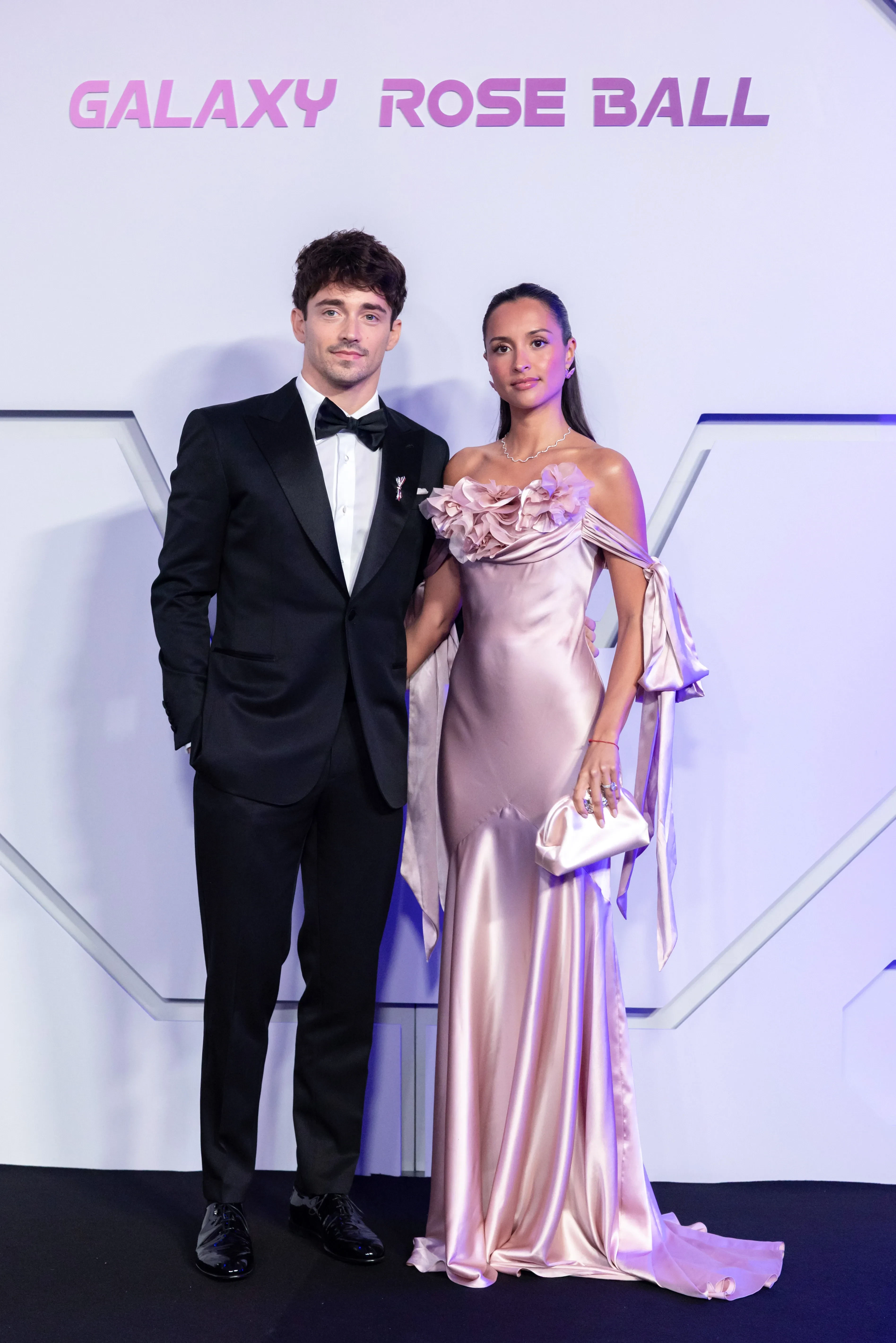 Шарль и Александра ЛеклерВ этом году темой мероприятия был "Галактический розовый бал". По этому случаю модель и блогер Александра Леклер (в девичестве Сент-Мле) выбрала струящееся платье в пол светло-фиолетового оттенка, лиф которого украшали пышные цветы. Образ дополнял минималистичный клатч в тон к платью, а волосы девушка собрала в гладкую прическу с ниспадающими на спину волосами. Шарль Леклер выбрал чёрный классический смокинг с бабочкой.