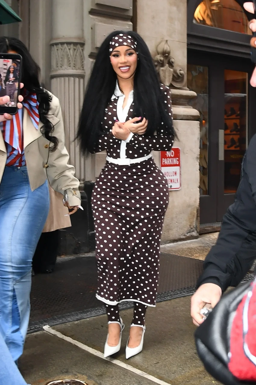 33-летнюю рэпершу засняли в Нью-Йорке перед презентацией её новой линии средств по уходу за волосами. Для выхода в свет она выбрала коричневое платье в горошек от французского бренда Rowen Rose, дополнив наряд похожей повязкой для волос и остроносыми туфлями на шпильке. Однако поклонники обратили внимание на изменения во внешности Карди: многие отметили, что артистка стала выглядеть моложе и "миловидней", предположив, что она сделала подтяжку лица. При этом некоторые посчитали, что Би выглядит "отёкшей", и сделали вывод, что она злоупотребляет ботоксом.