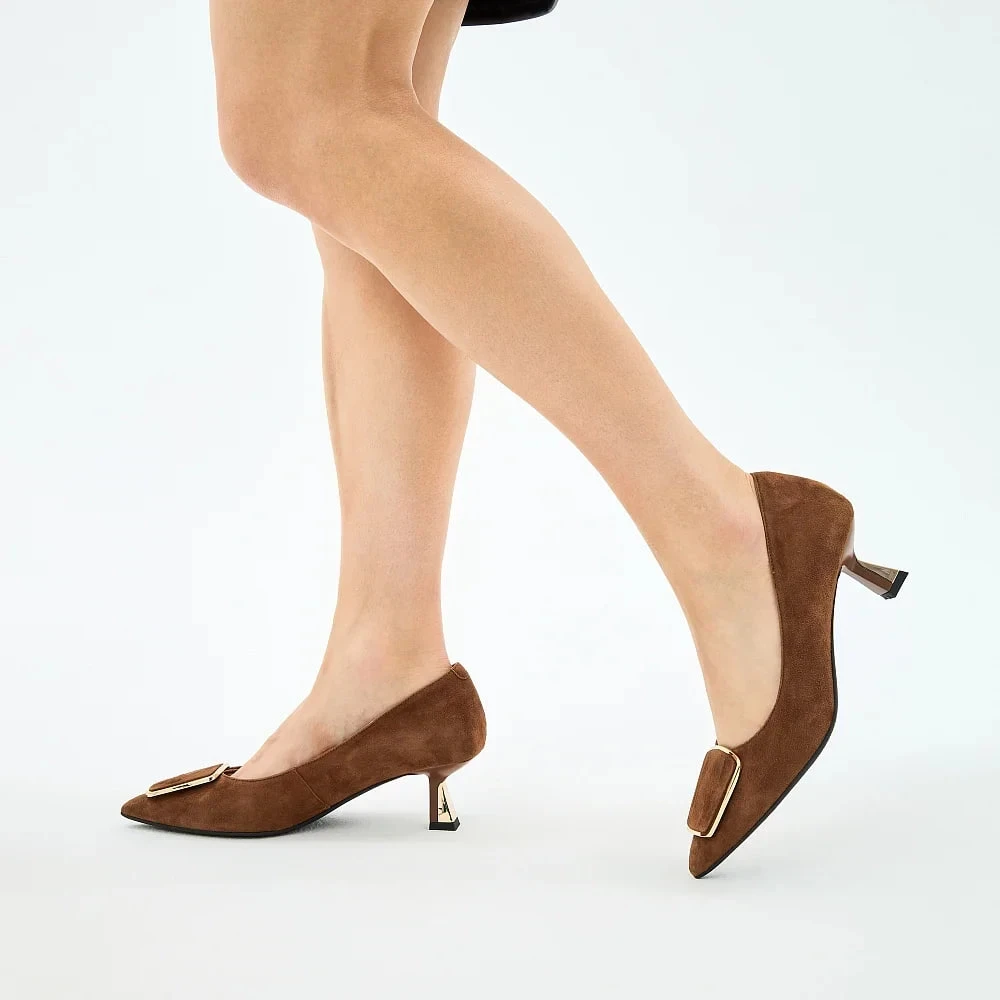 Тёплые шоколадные оттенки — стильная альтернатива чёрному. Велюровая текстура делает образ мягче и глубже. Такая пара отлично сочетается с бежевыми, золотистыми и молочными нарядами и легко «перекочует» в повседневный гардероб после праздников.