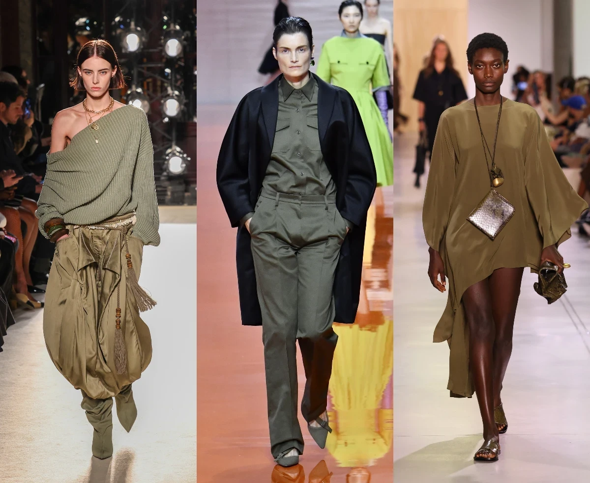 Он идеально сочетается почти со всей палитрой сезона: с белым и серым выглядит сдержанно, с оранжевым и терракотой — свежо, с фиолетовым — артистично. Особенно эффектно оливковый смотрится в сложных текстурах — коже, дениме, льне или с актуальной бахромой, балансируя между практичностью и модным заявлением.