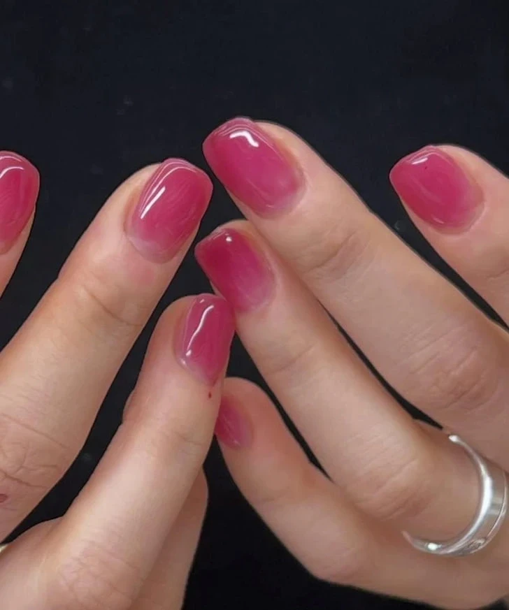 Маникюр с эффектом «желе» подчёркивает основные тренды: короткую длину, приглушённые оттенки и мягкую текстуру. Популярны сливовые и серо-розовые оттенки, которые создают спокойный и утончённый образ.