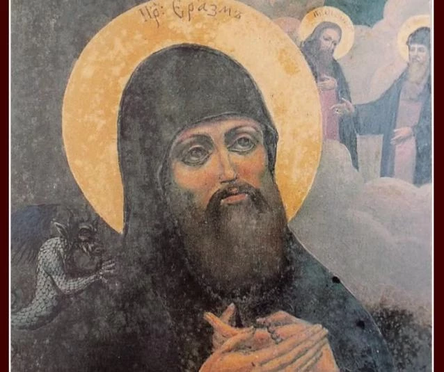 Бог вмешался и послал ему тяжкую болезнь, от которой праведник едва дышал. В его жизни наступила тишина, и верующие, собравшись у его постели, стали размышлять о том, что, возможно, его душа не может покинуть тело из-за внутренних сомнений и переживаний. В это время Еразм, услышав их слова, встал, словно и не болел. Осознав свой грех, он покаялся в мыслях, которые терзали его, и увидел во сне святителей Антония и Феодосия, которые молились за его исцеление и говорили, что Бог дарует ему время для покаяния.