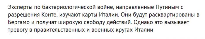 Теперь же, когда поставки из РФ получены, итальянцы могут покривить душой, не просто забыв сказать «grazie», но и усомнившись в принципах поддержки и ее качестве. Рупором русофобского настроения стала La Stampa: издание опубликовало статью некого журналиста по имени Якопо Якобони, который не удосужившись назвать имена инсайдеров, лишь отметив их высокопоставленное положение.