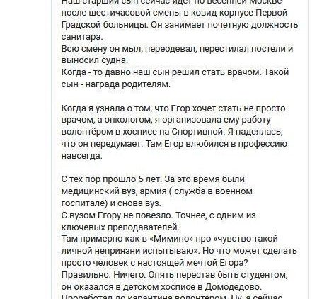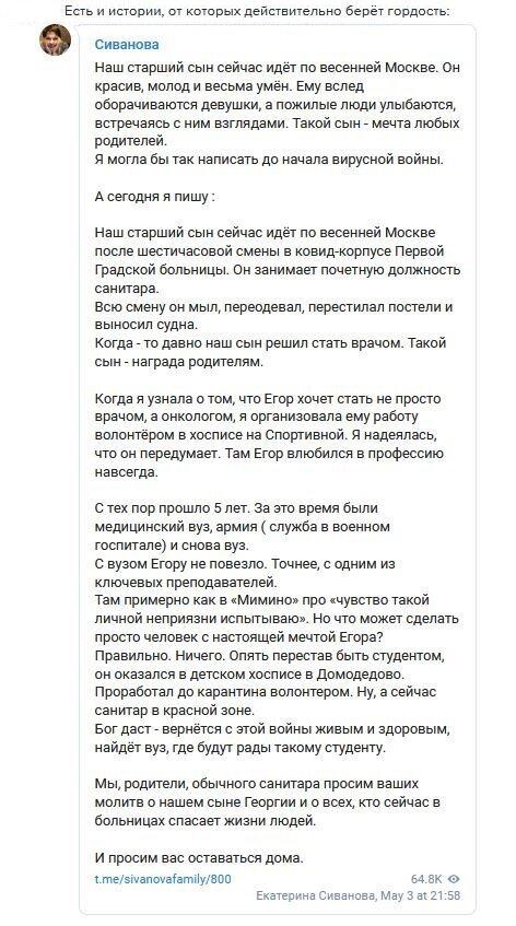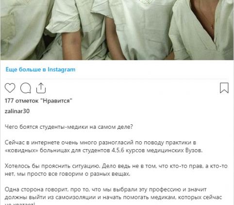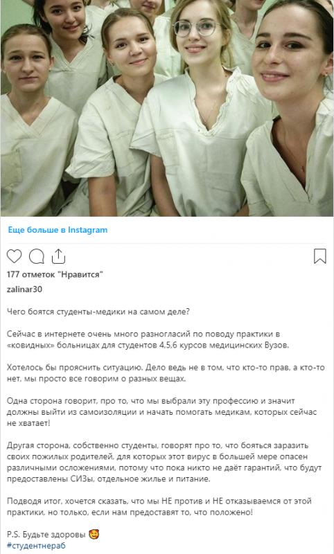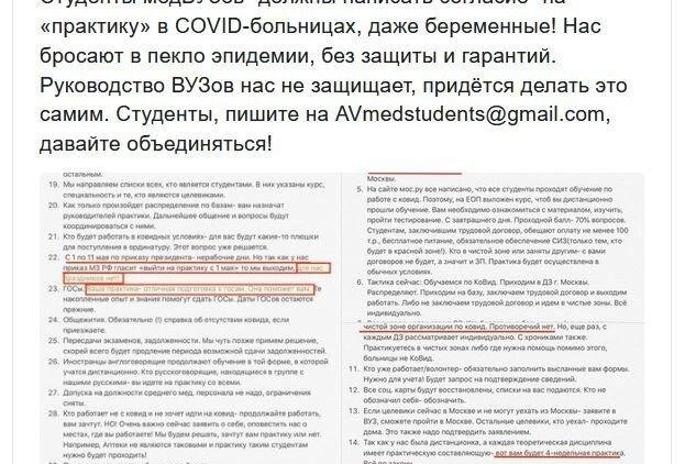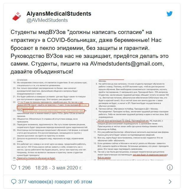 «Власть решила отправить на принудительную практику к больным с коронавирусом самую уязвимую и подневольную группу – студентов. Медперсонал же в России используется как просроченная тряпка? Относятся по-скотски, вот они все и увольняются. А властям нужно хоть кого-то на борьбу отправлять».