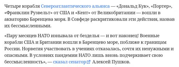 Однако, альянс не учел, что своими маневрами принес РФ гораздо больше пользы, чем провокации — российскому флоту как раз не хватало работы с иностранными кораблями. Северный флот встретил корабли НАТО и в очередной раз взял их на сопровождение, а российские моряки таким образом получили прекрасную возможность повысить боеготовность, отработав теорию на практике.