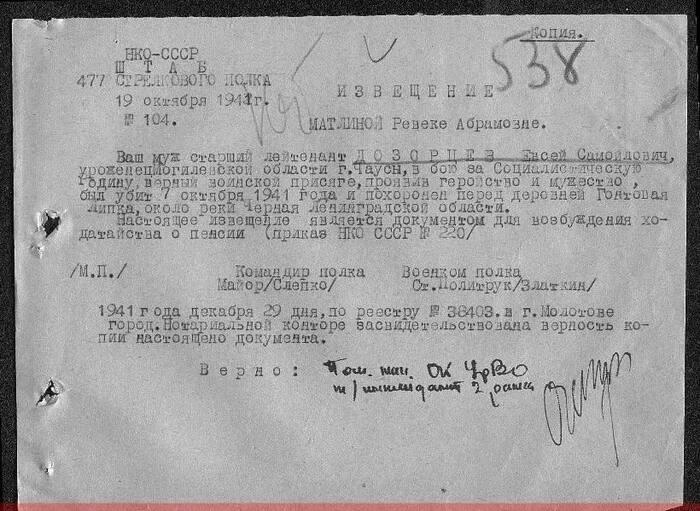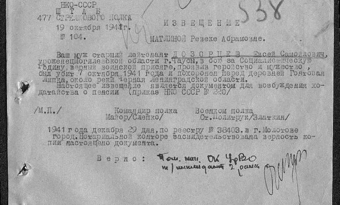 …Мой дед, старший лейтенант Евсей Дозорцев, погиб 7 октября 1941 года у Черной речки, под Ленинградом, в результате прорыва немцами обороны неподалеку от деревни Гонтовая Липка. Вместе с ним в тот день погибли многие бойцы 2-й минометной роты 477 гвардейского полка, но фамилий погибших в рапорте о произошедшем нет.