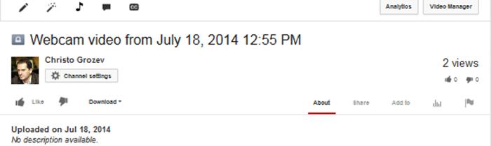 18 июля 2014 года в 12:55 Христо записал и опубликовал на YouTube короткое тестовое видео. Ниже приведен скриншот Менеджера видео YouTube.
