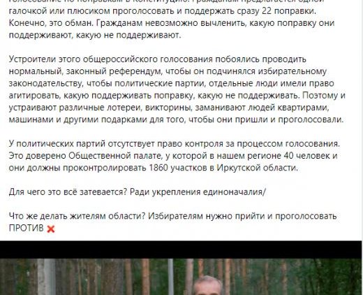 Больше всего печалит тот факт, что многие действительно убеждены, что для участия в викторинах и розыгрышах нужно прийти и проголосовать именно «За» поправки. Удивлю, но нет - в лотереях можно участвовать даже тогда, когда человек проголосовал «против». Подобной информацией, по всей вероятности, не обладает депутат КПРФ в Иркутской области Сергей Лёвченко , который разместил в «Вконтакте» пост с жёстким призывом пойти и проголосовать против поправок.