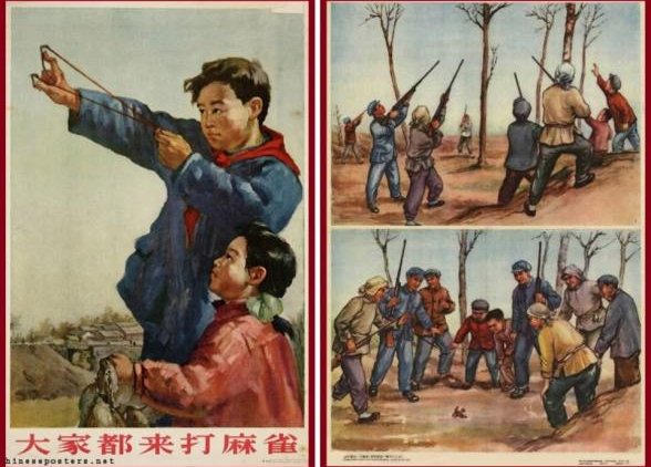 Мао поднял весь народ на войну с воробьями. Отстреливали все и везде. Дело дошло до того, что гордые китайцы поднимались на деревья и крыши домов, чтобы не позволить воробьям передохнуть и чтобы те устали и сдохли в полете.