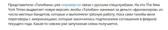Несмотря на то, что Пентагон не подтверждает противоправных действий России в отношении американских военных в Афганистане, демократы своих подозрений не снимают. От бессилия досрочно отлучить нынешнего хозяина белого дома от власти они продолжают тиражировать «предательство Трампом» американских военных в Афганистане — логическое продолжение вмешательства русских в президентские выборы 2016 года. Это значит, что читателям The New York Times еще предложат отведать порцию развесистой клюквы под названием «боевики на фрилансе», ведь под соусом из махровой русофобии гораздо сподручней и дальше дискредитировать президента.