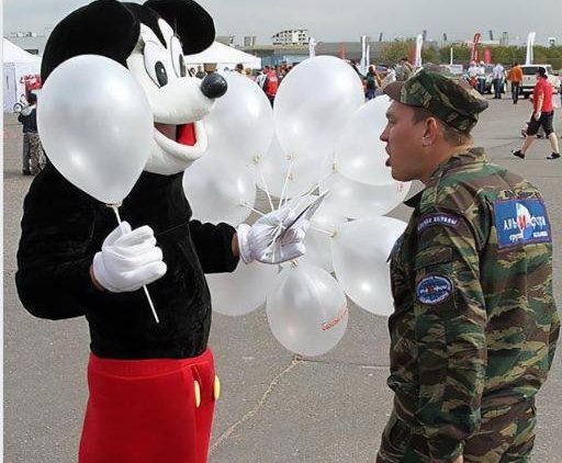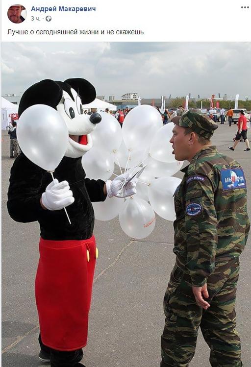 И действительно – надолго певца либеральных свобод не хватило, его следующим сообщением стал репост со страницы коллеги по либеральному цеху Льва Рубинштейна с фотографией, изображающей «наезд» жлобоватого охранника в камуфляже на ростовую куклу с шариками.