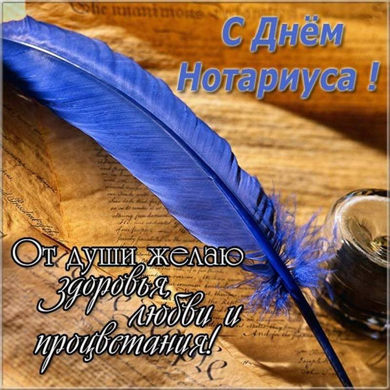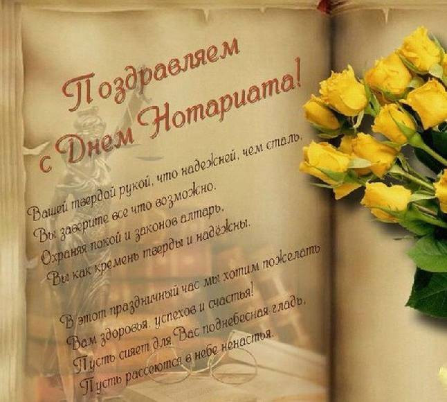 Искренне поздравляю с Днём нотариуса и желаю в этот праздник крепкого здоровья, бравых сил и высоких целей. Желаю всегда придерживаться курса справедливости и честности, добиваться всех поставленных задач и желаний, получать щедрое вознаграждение от жизни за добрые дела и отменные успехи.
