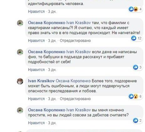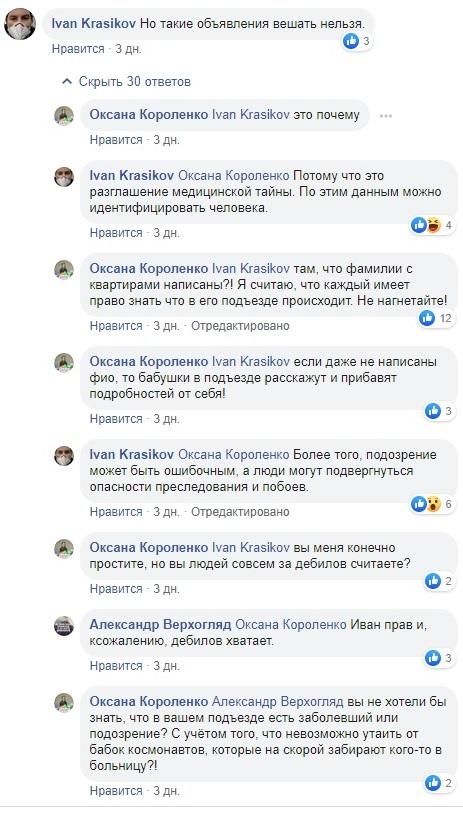 "Но такие объявления вешать нельзя", "Потому что это разглашение медицинской тайны. По этим данным можно идентифицировать человека", "там, что фамилии с квартирами написаны?! Я считаю, что каждый имеет право знать что в его подъезде происходит. Не нагнетайте", "Более того, подозрение может быть ошибочным, а люди могут подвергнуться опасности преследования и побоев", "Ну да,лучше знать что в твоём доме/подъезде есть заболевший.. а дебилов всегда хватает,и дай Бог что б близкие недалёких людей не заболевали......реалии нашего воспитания или национальности говорят нам о том,дай повод разорвут на части-о соболезновании или о сопомощи речи не идёт каждый боится только за свой зад", "Правильно делают, что предупреждают людей об осторожности", - написали в комментариях пользователи.